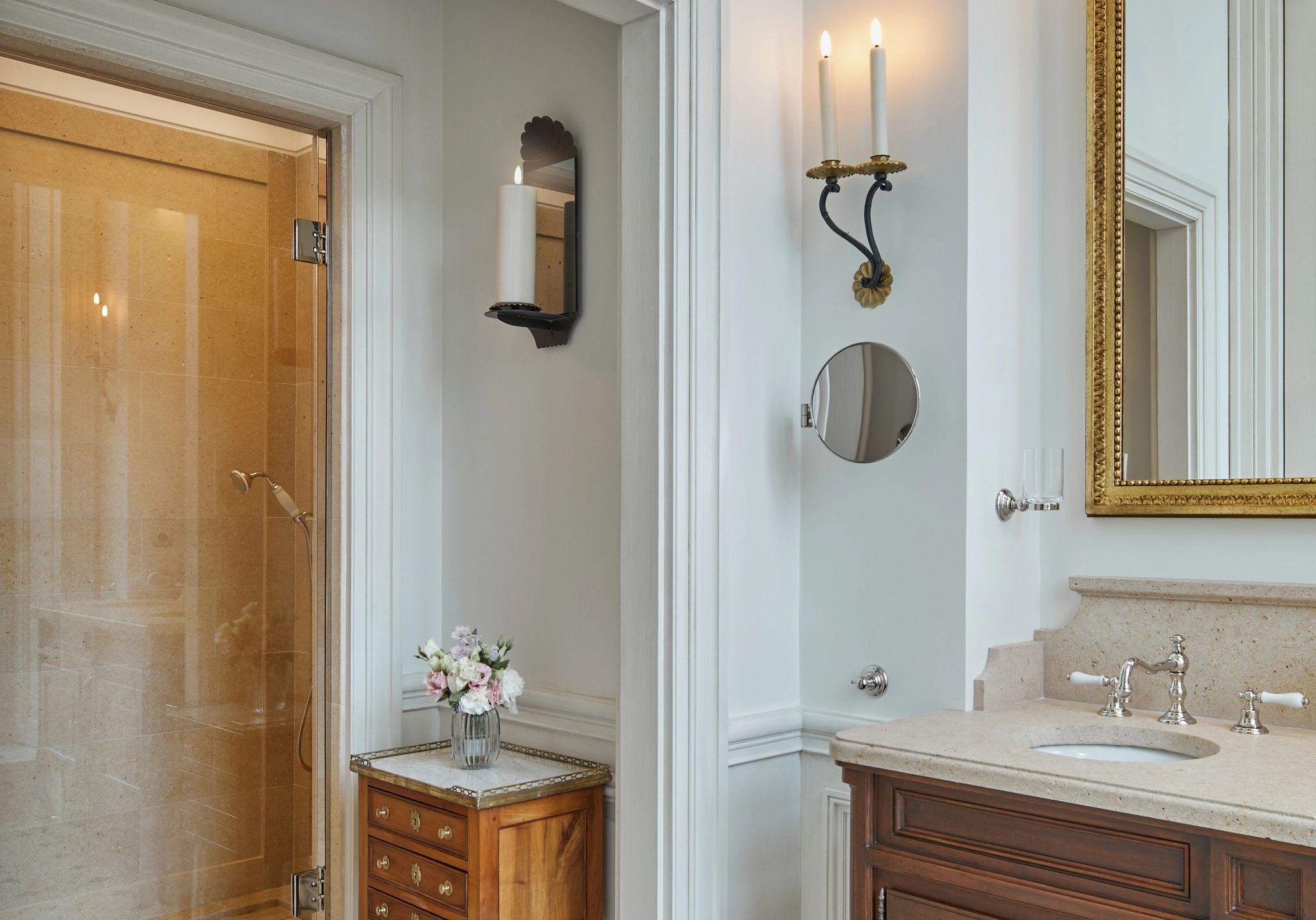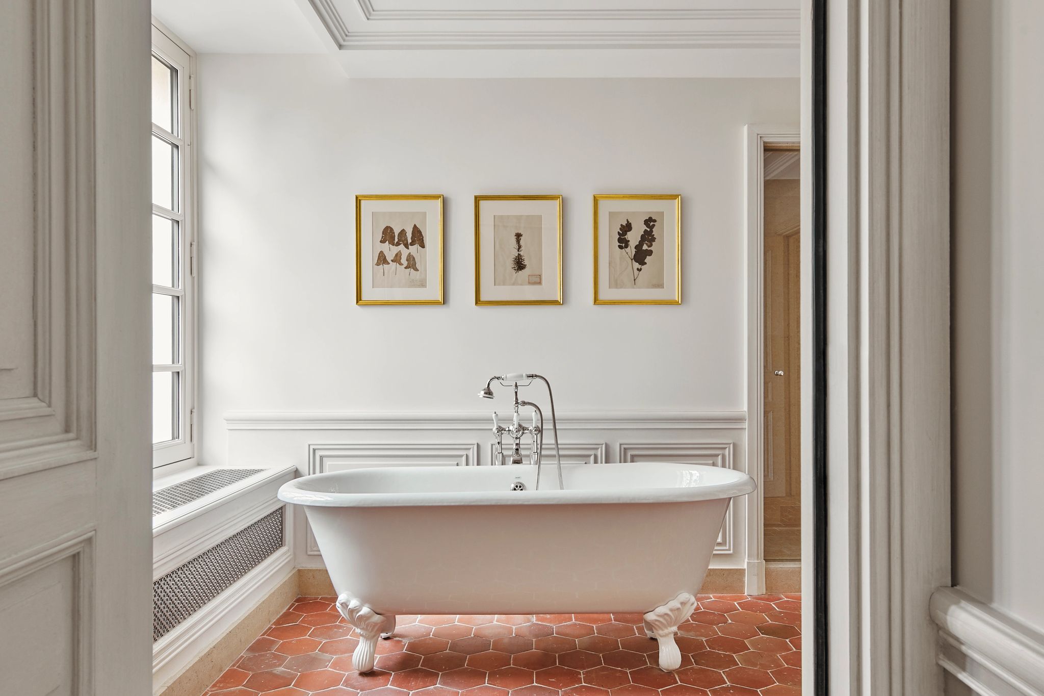 Sob o brilho suave dos candelabros e a elegância dos móveis de época, o quarto Baron de Staël Holstein envolve em uma atmosfera do século 18. Banheira de estilo clássico, objetos artesanais e piso em parquet chevron preenchem o ambiente um charme clássico.