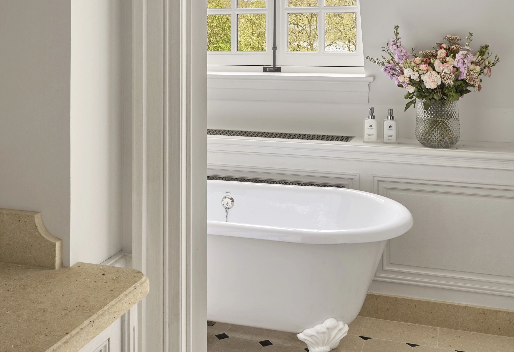Com tetos de 4 metros de altura e piso em parquet Versailles, a The Necker Suite exala o luxo do século 18. A vista espetacular do jardim da Orangerie, do Lago dos Guardas Suíços e do próprio palácio traz uma sensação de grandiosidade. O espaçoso banheiro, com banheira vitoriana e vista para o esplendor ao redor, proporciona uma imersão total no charme histórico do local.