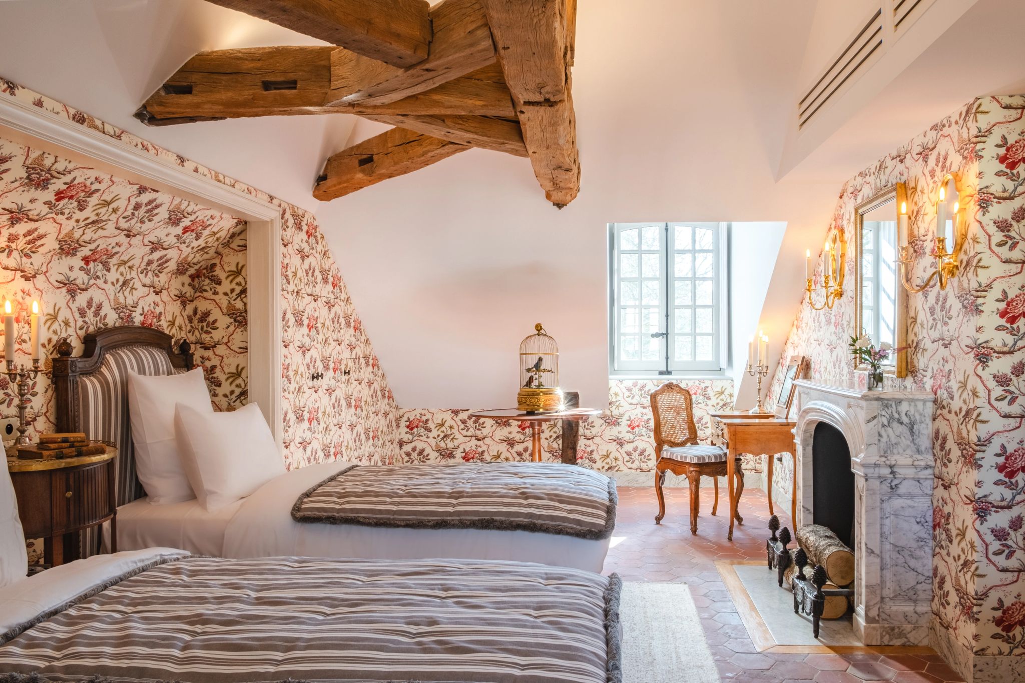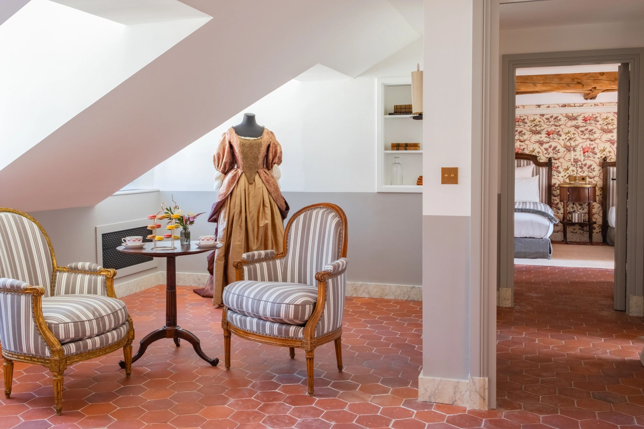 Ao entrar na Rose Bertin Suite, uma viagem no tempo começa. Vigas expostas, piso terracota e móveis do século 18 trazem a sofisticação clássica.