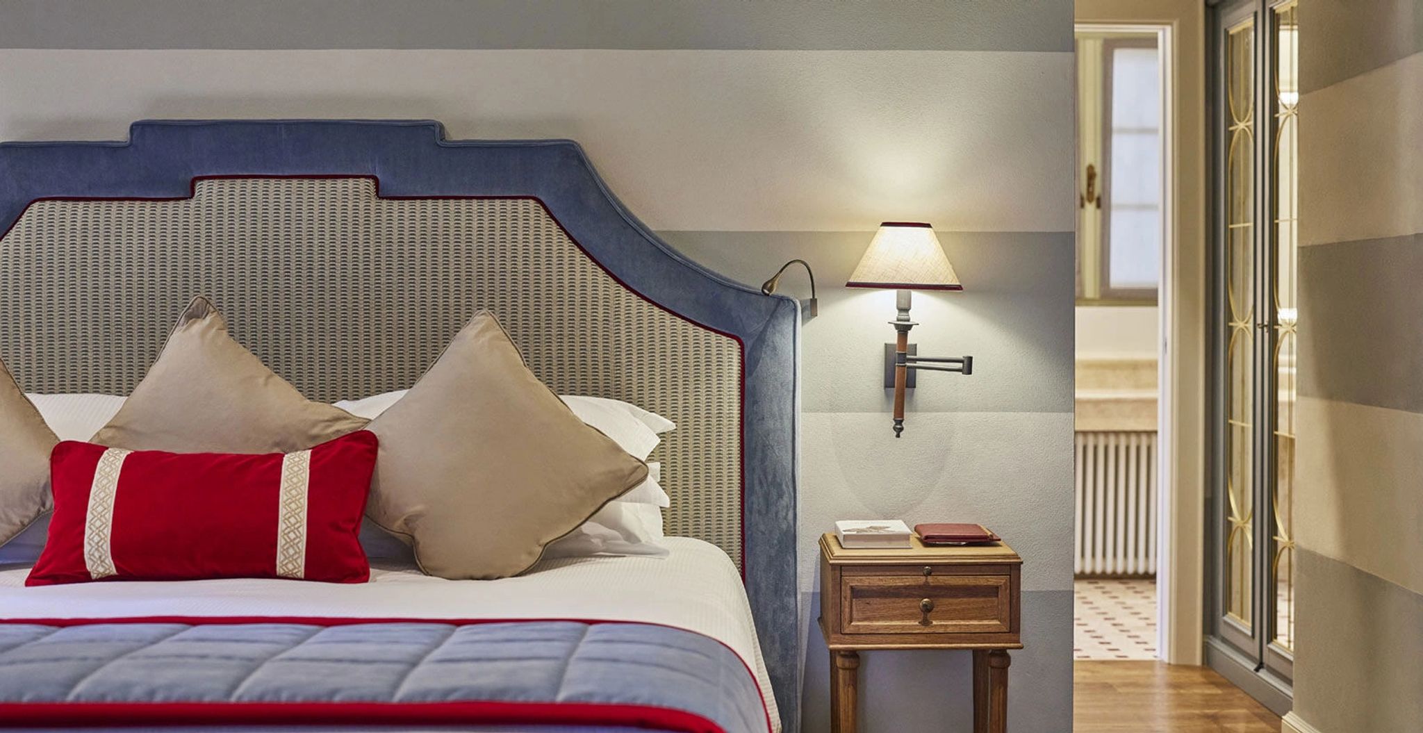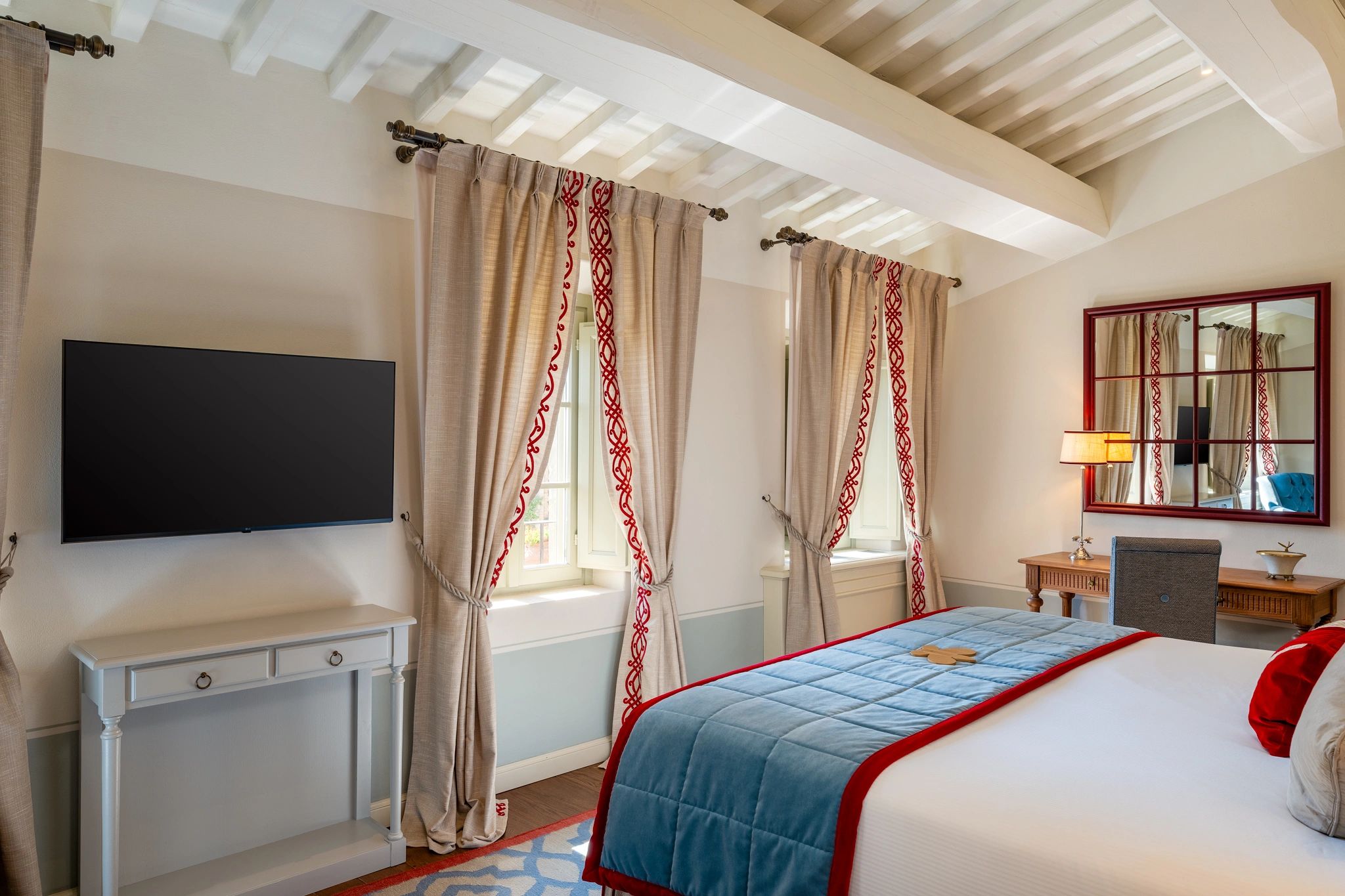 Envolto em tons de azul e vermelho, o Premium Deluxe cativa ao final do dia com seus lençóis brancos em algodão. A decoração evoca a rica tradição romana, com uma penteadeira clássica e detalhes históricos em madeira de carvalho.
