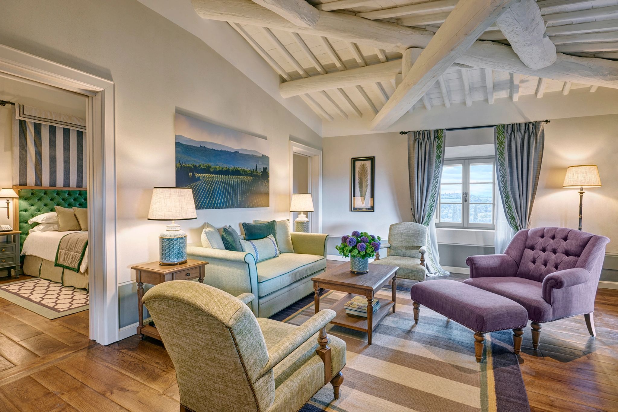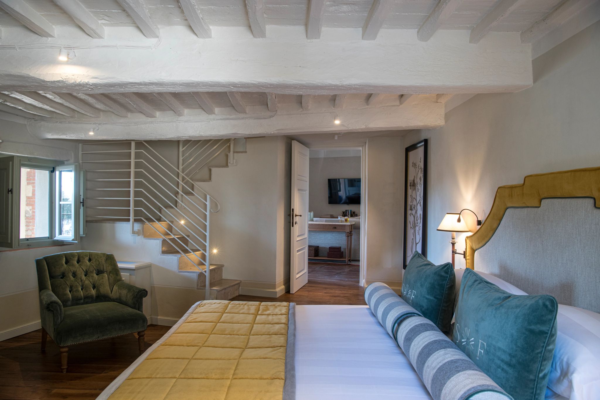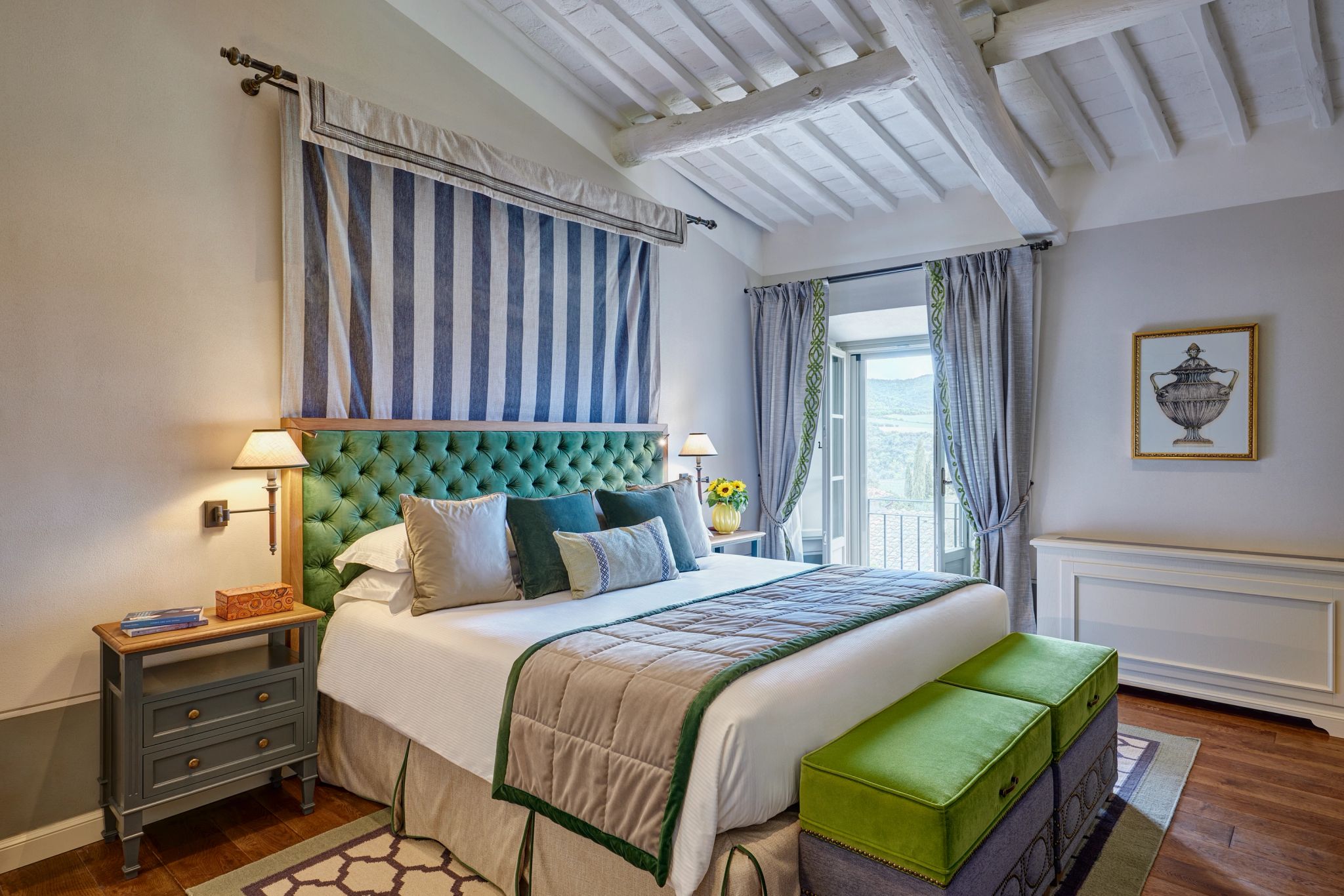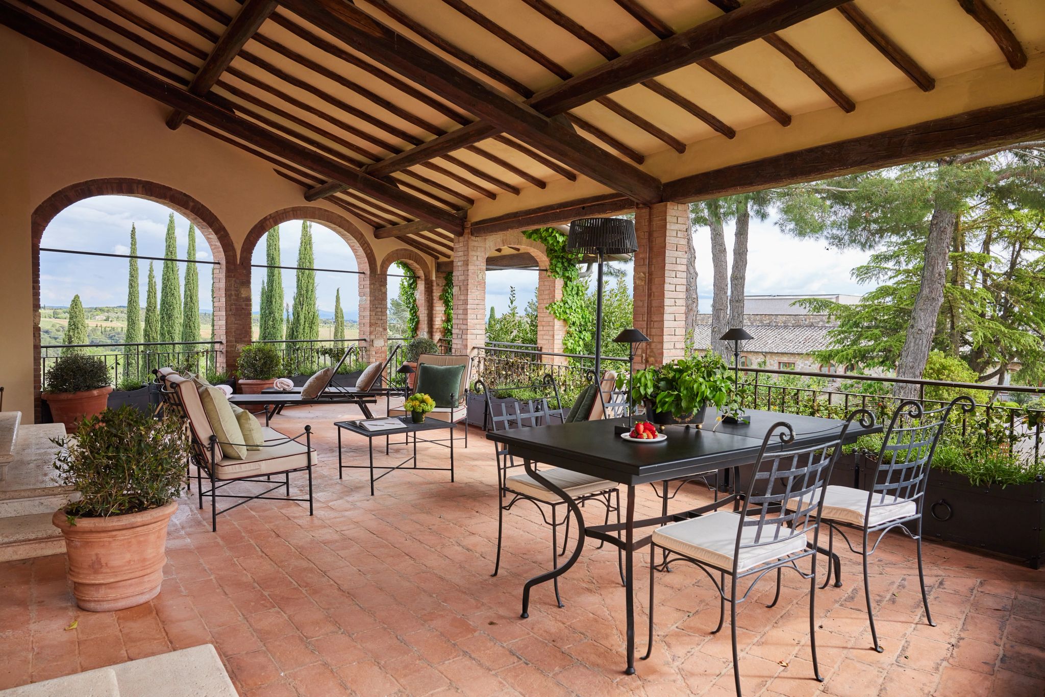 O terraço da Signature Suite La Loggia, com sua arquitetura clássica de pedras e arcos, é um convite ao encantamento. É o cenário perfeito para uma refeição acompanhada pela brisa suave do campo, com vistas deslumbrantes das colinas e vinhedos. A suíte se ilumina com a luz natural que entra através das grandes janelas, e cada detalhe da decoração revela a preciosa tradição italiana.