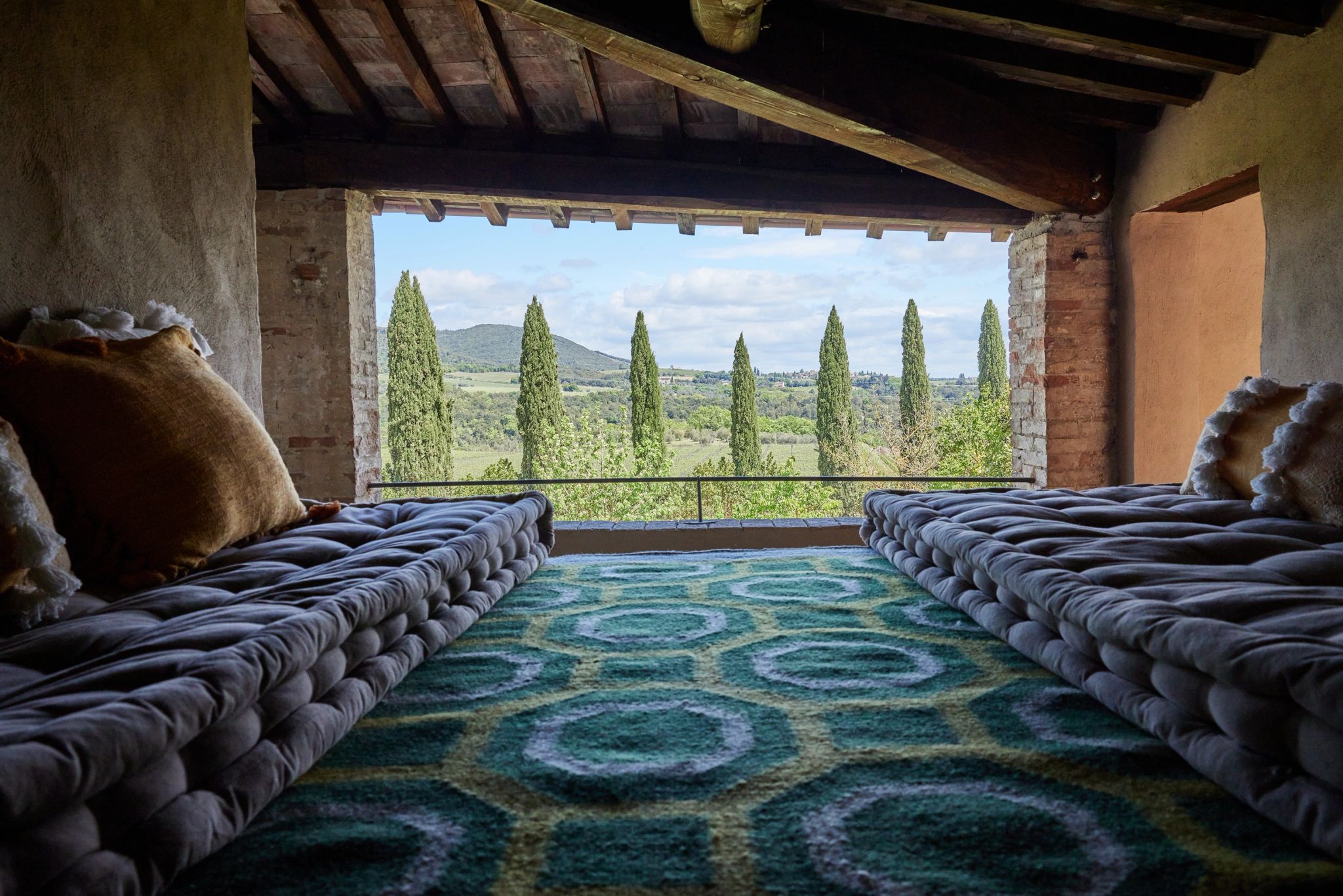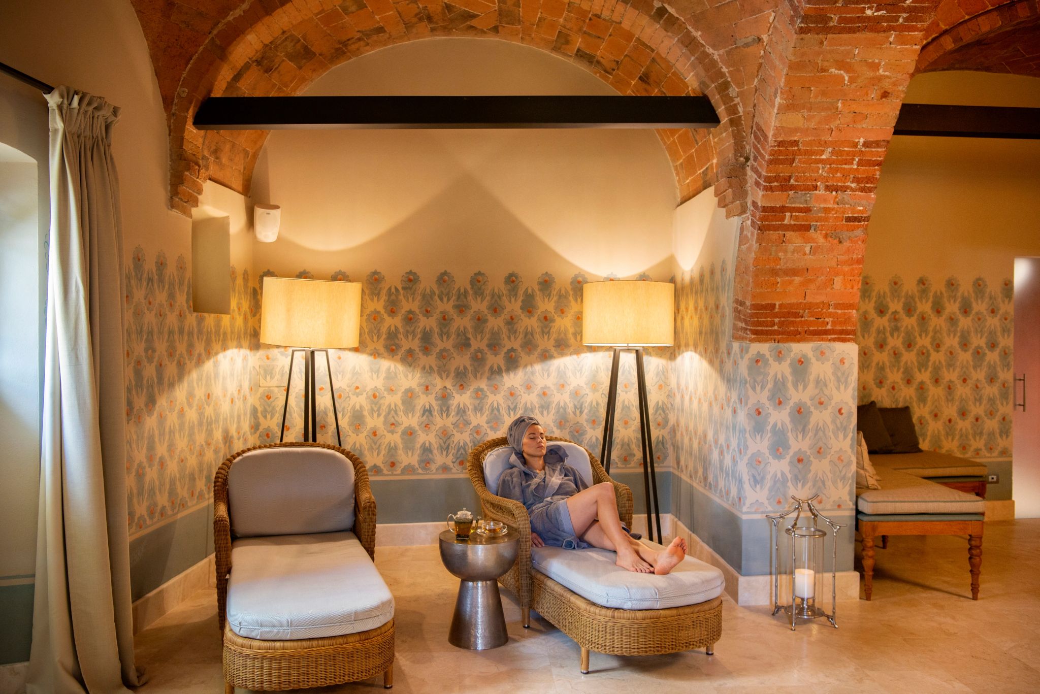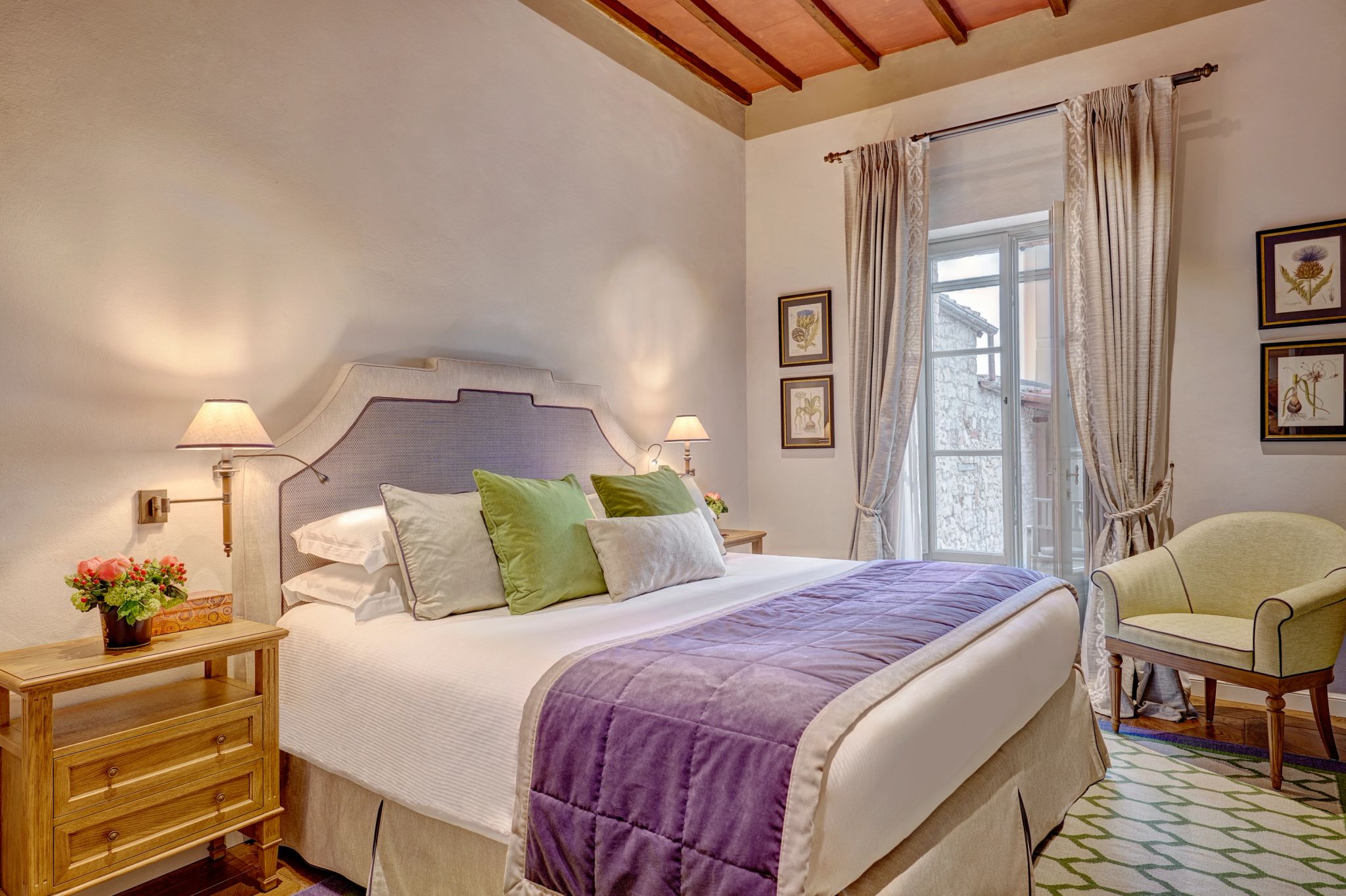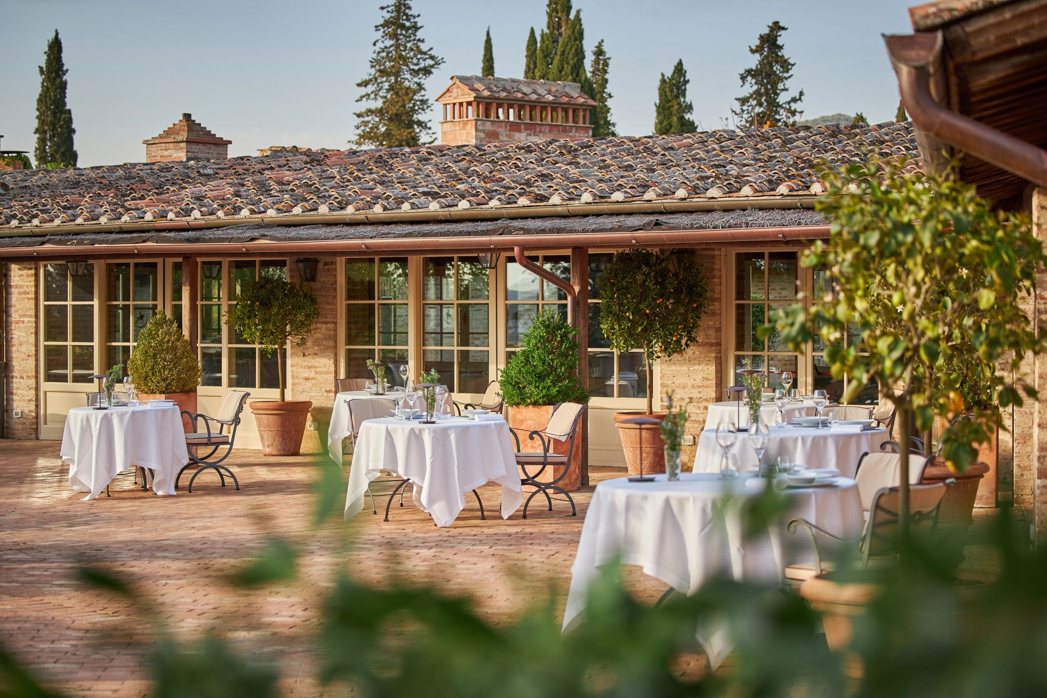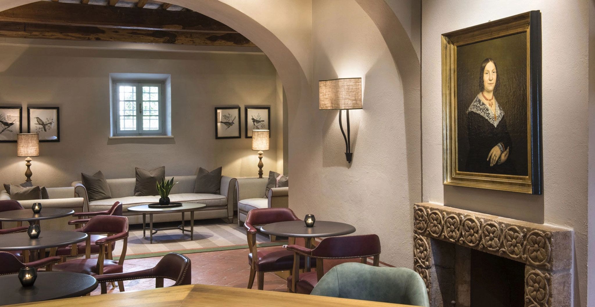 O terraço da Signature Suite La Loggia, com sua arquitetura clássica de pedras e arcos, é um convite ao encantamento. É o cenário perfeito para uma refeição acompanhada pela brisa suave do campo, com vistas deslumbrantes das colinas e vinhedos. A suíte se ilumina com a luz natural que entra através das grandes janelas, e cada detalhe da decoração revela a preciosa tradição italiana.