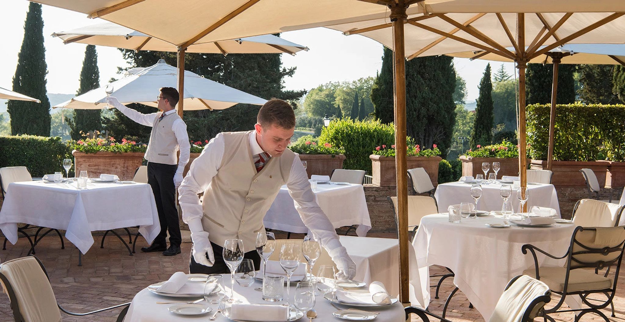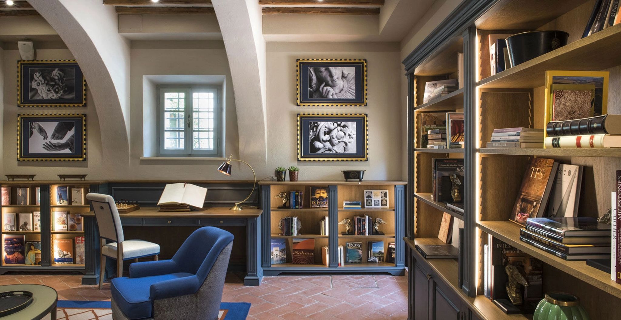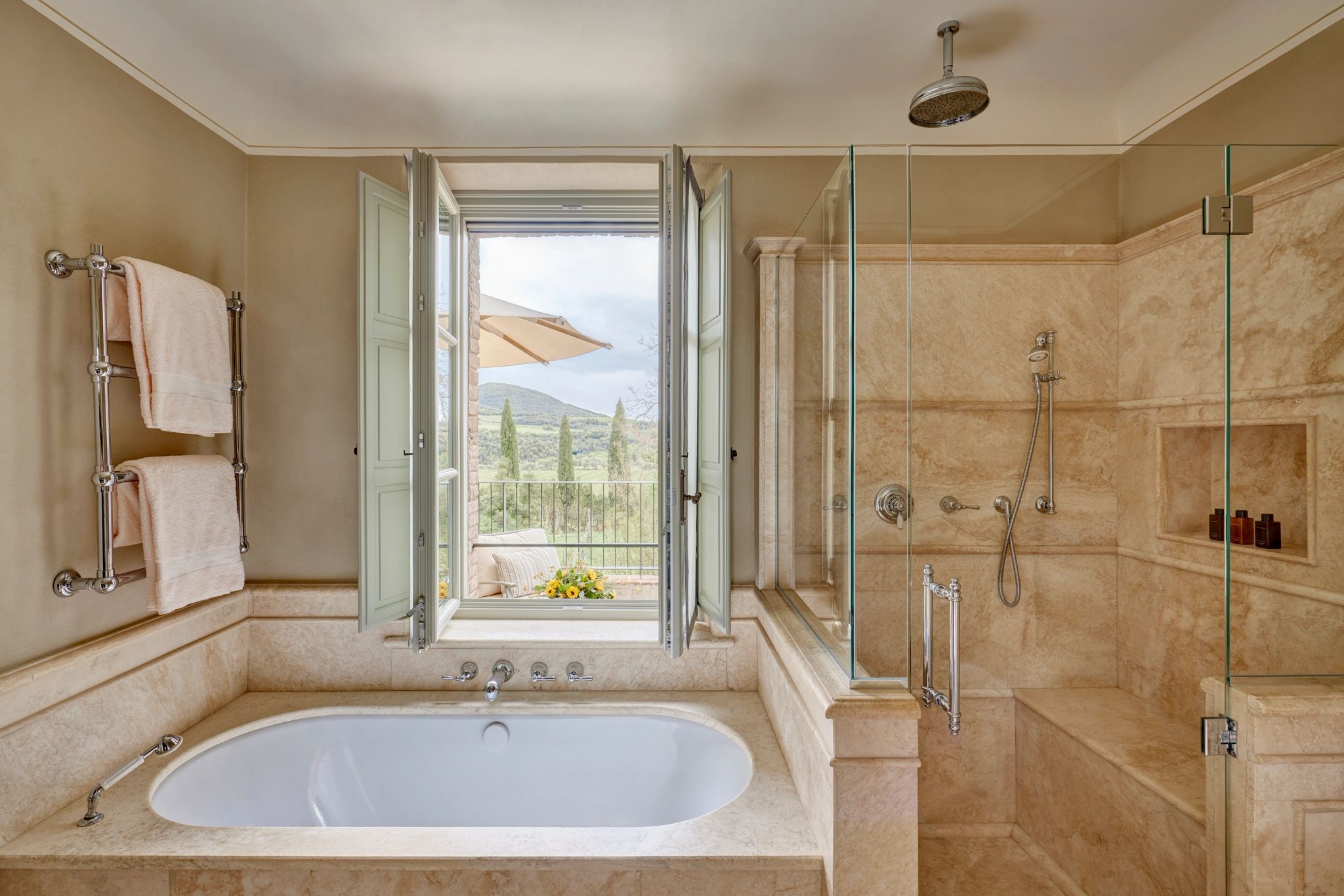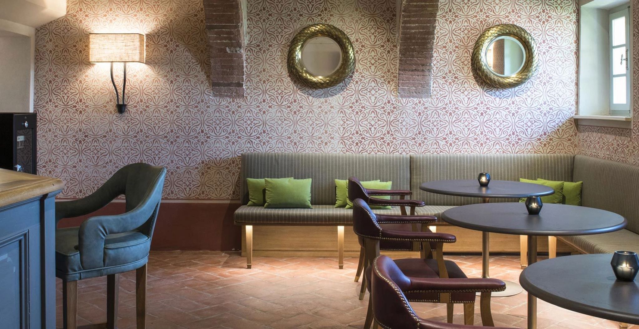 O terraço da Signature Suite La Loggia, com sua arquitetura clássica de pedras e arcos, é um convite ao encantamento. É o cenário perfeito para uma refeição acompanhada pela brisa suave do campo, com vistas deslumbrantes das colinas e vinhedos. A suíte se ilumina com a luz natural que entra através das grandes janelas, e cada detalhe da decoração revela a preciosa tradição italiana.
