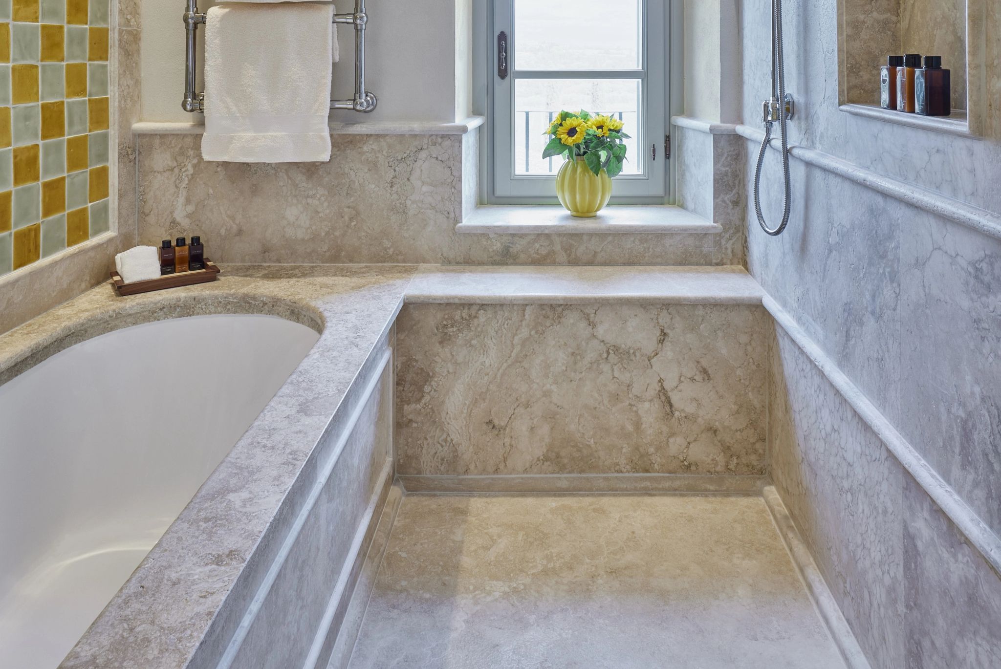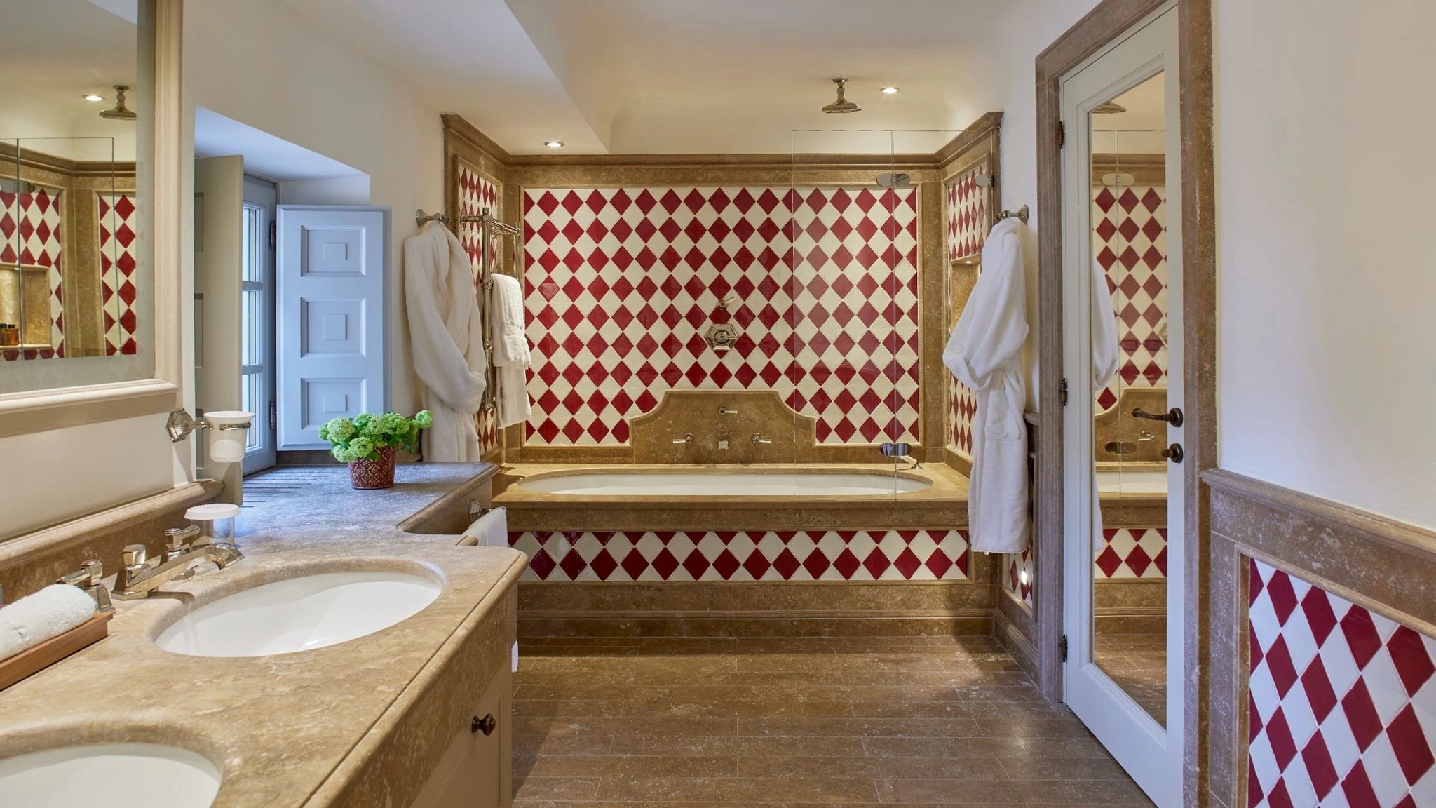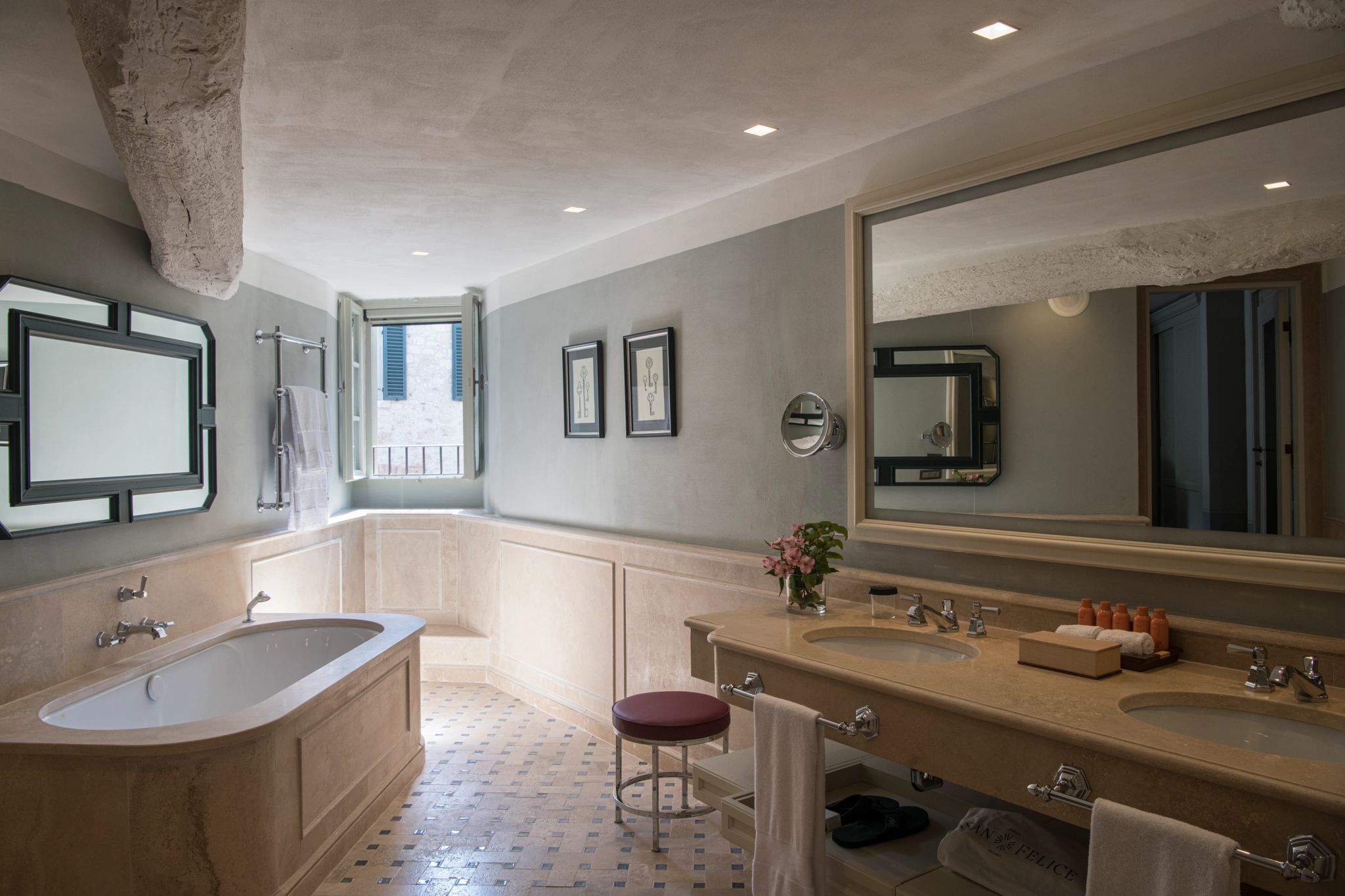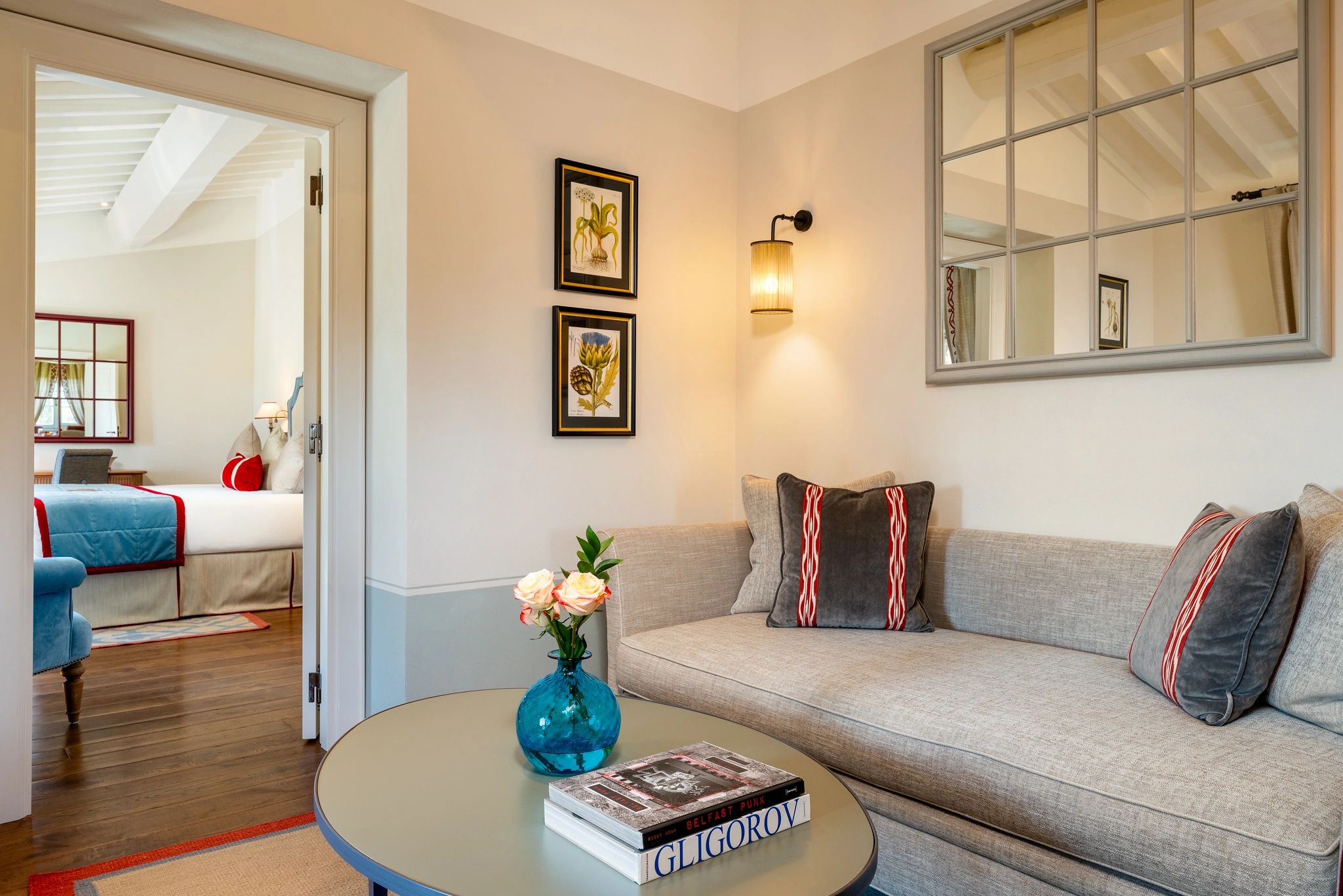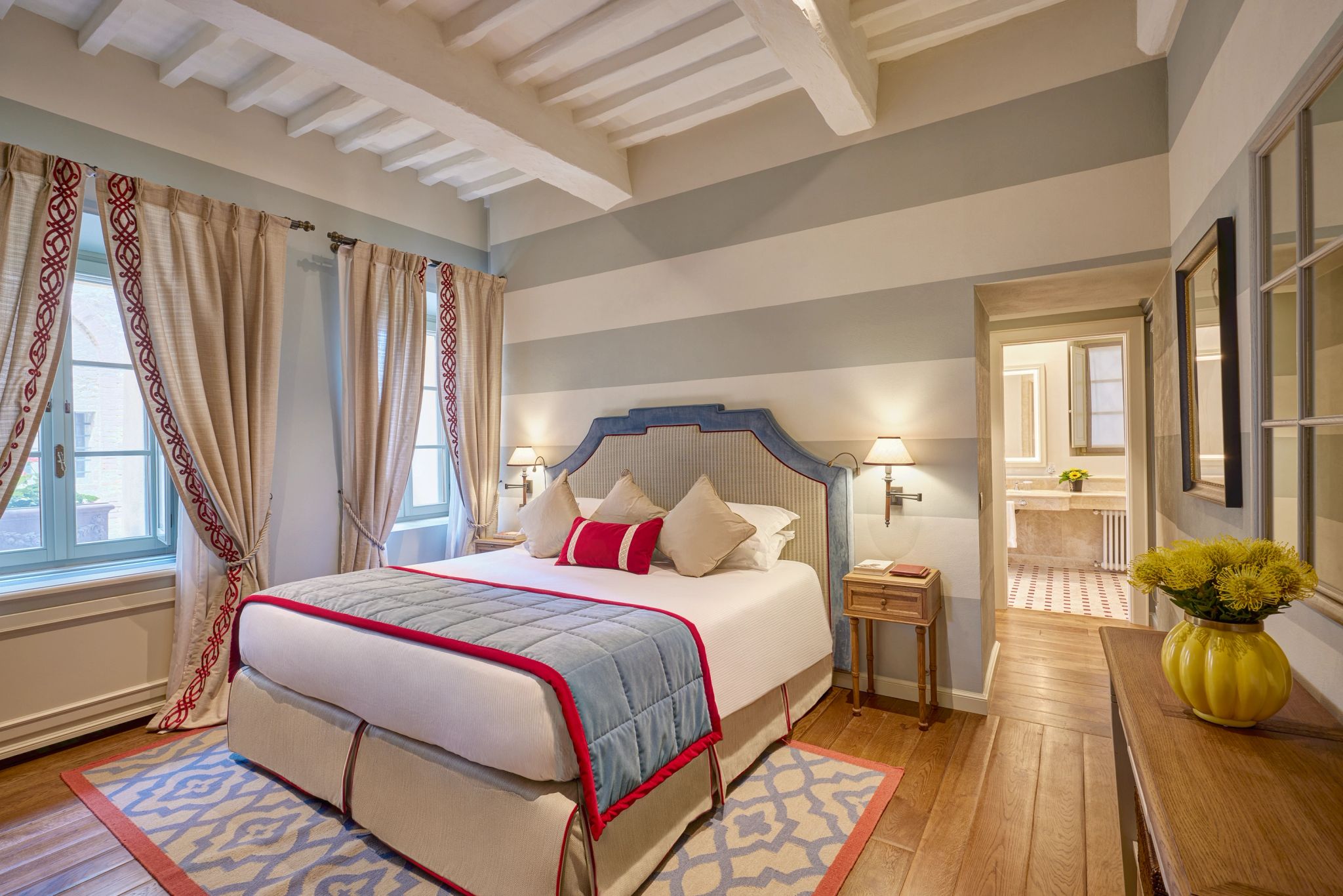 A Suite celebra a doce vida italiana com seus amplos espaços que incluem sala de estar para momentos sociais e banheiro revestido em cerâmicas italianas artesanais. Essa elegante suíte apresenta simbolismo em suas tonalidades: o azul representa o céu, o amarelo o sol e o vermelho o solo frutífero do Borgo San Felice.