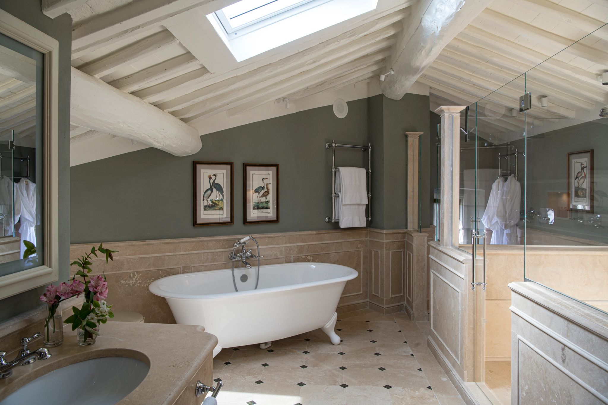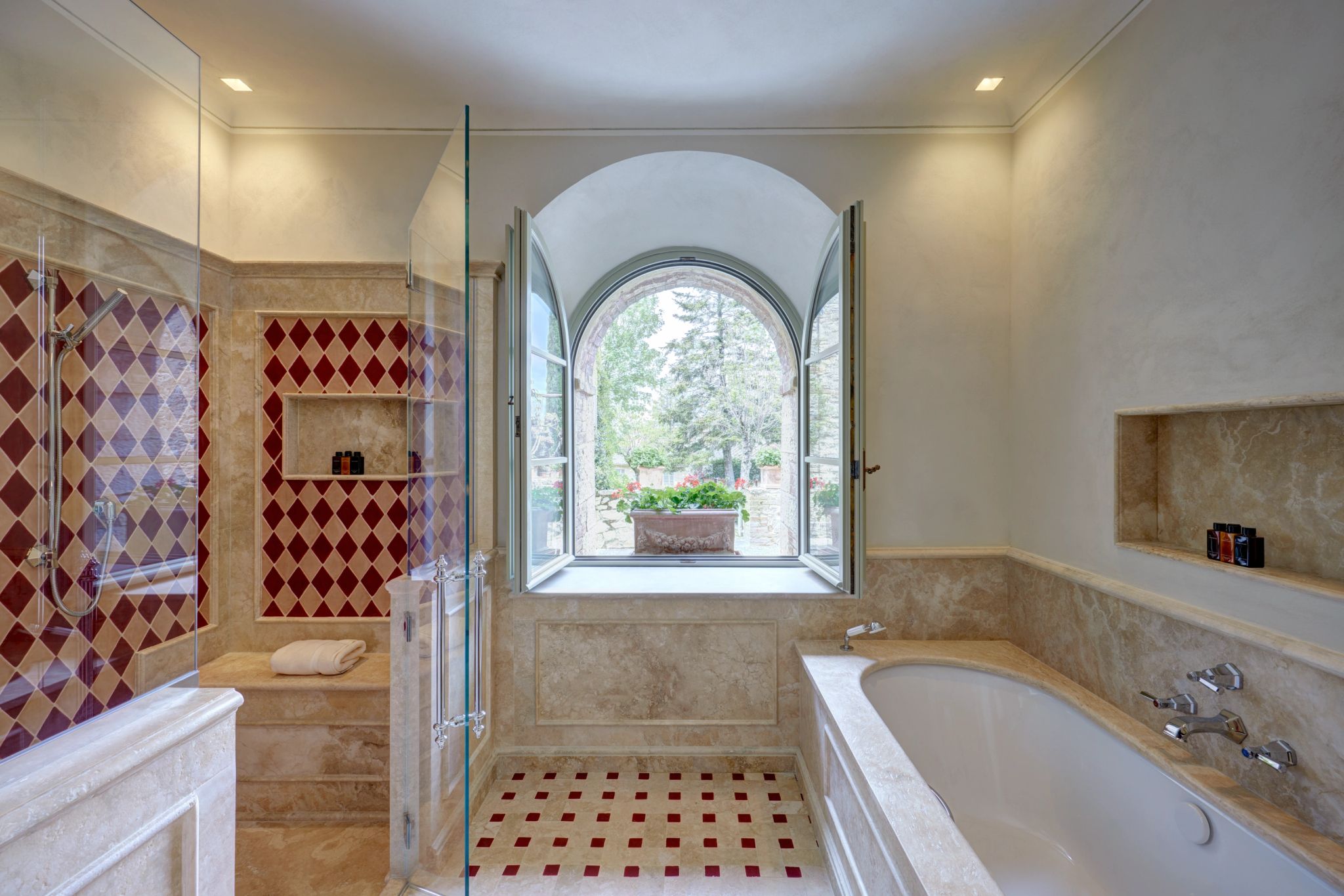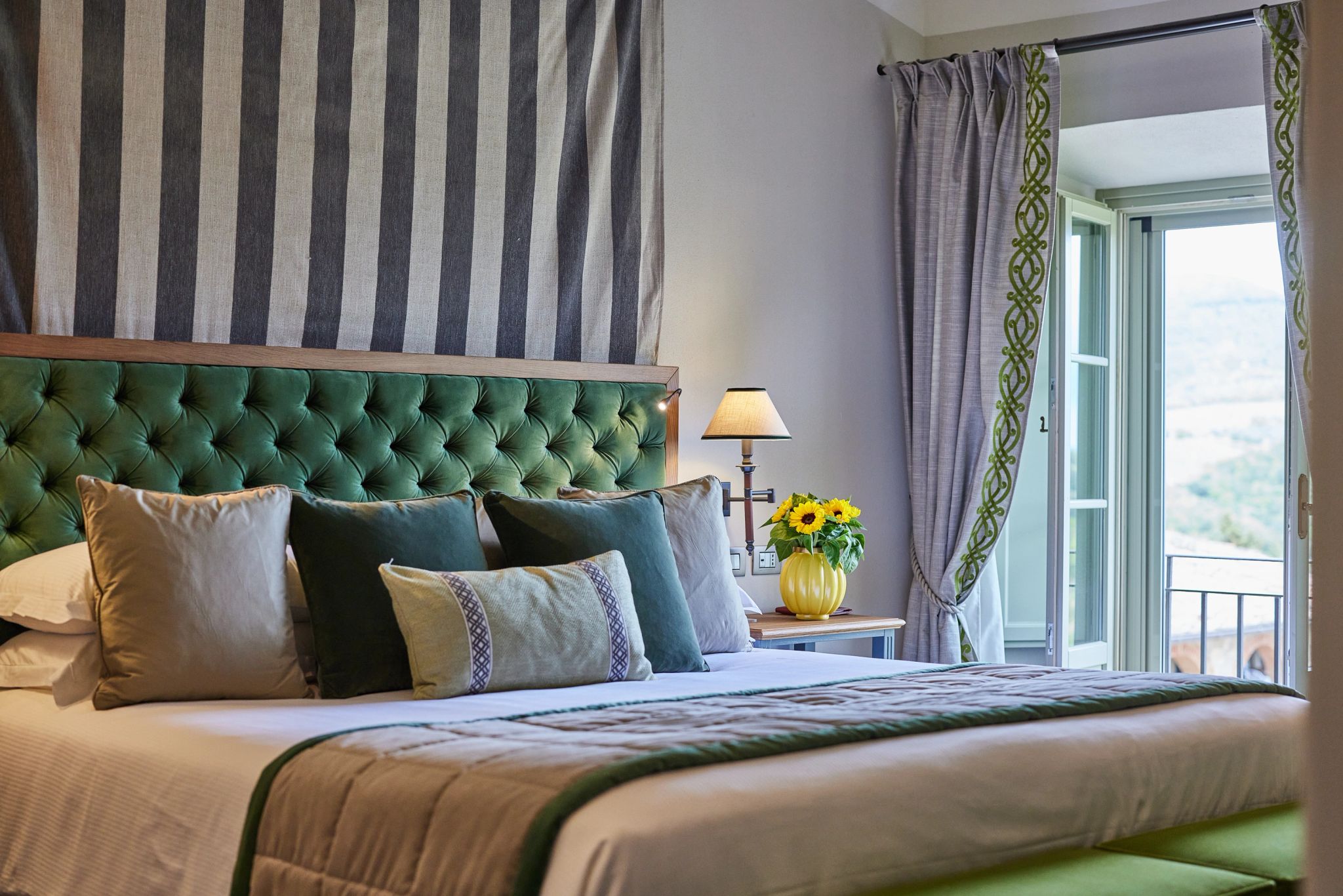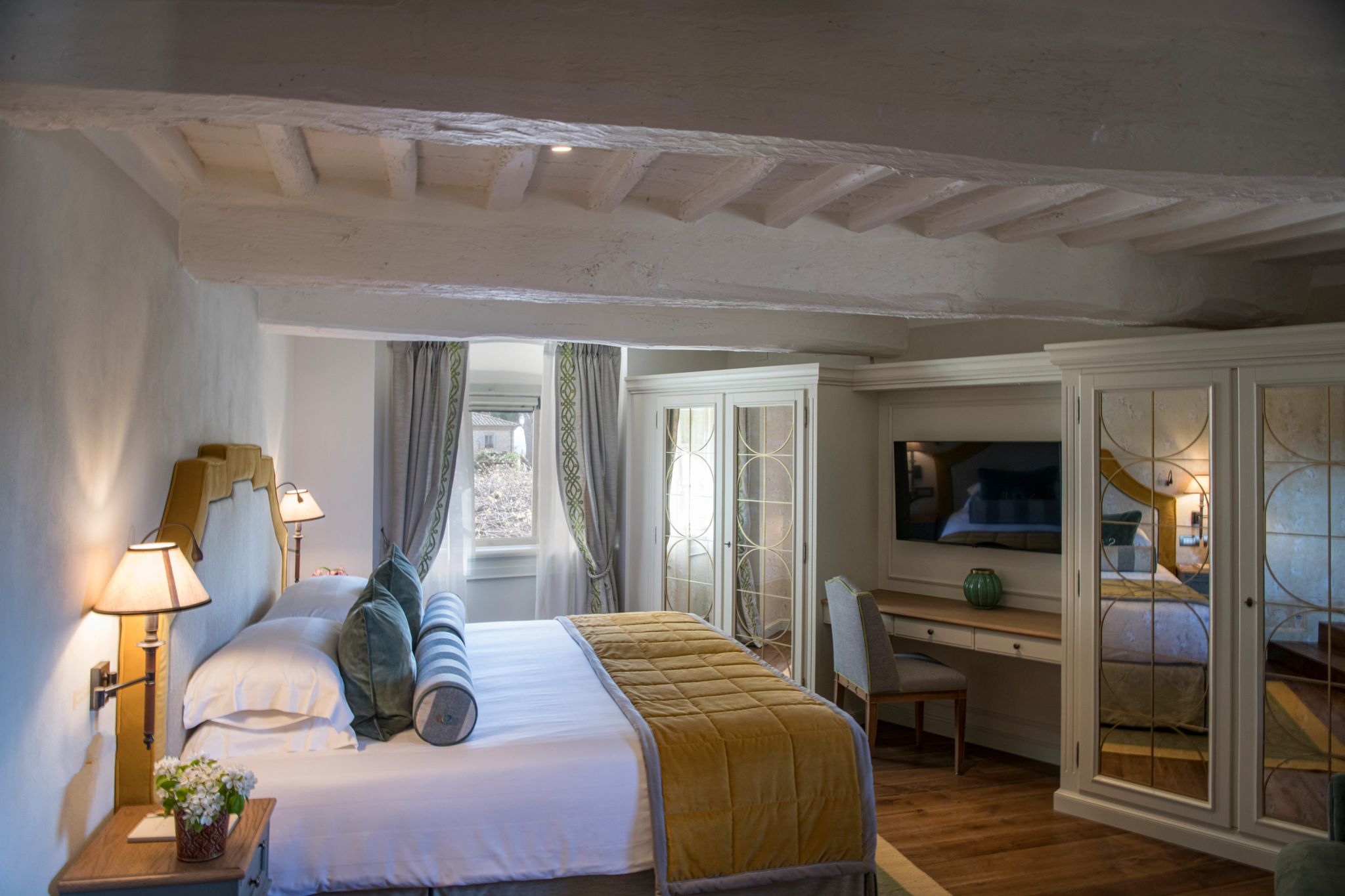 Com tonalidades esverdeadas encantadoras e detalhes refinados em estilo contemporâneo, a Suite Premium reflete a beleza natural típica da Toscana. Nessa acomodação prevalece a atmosfera de serenidade e as portas à francesa permitem sair para o espaço de um pequeno jardim privativo.