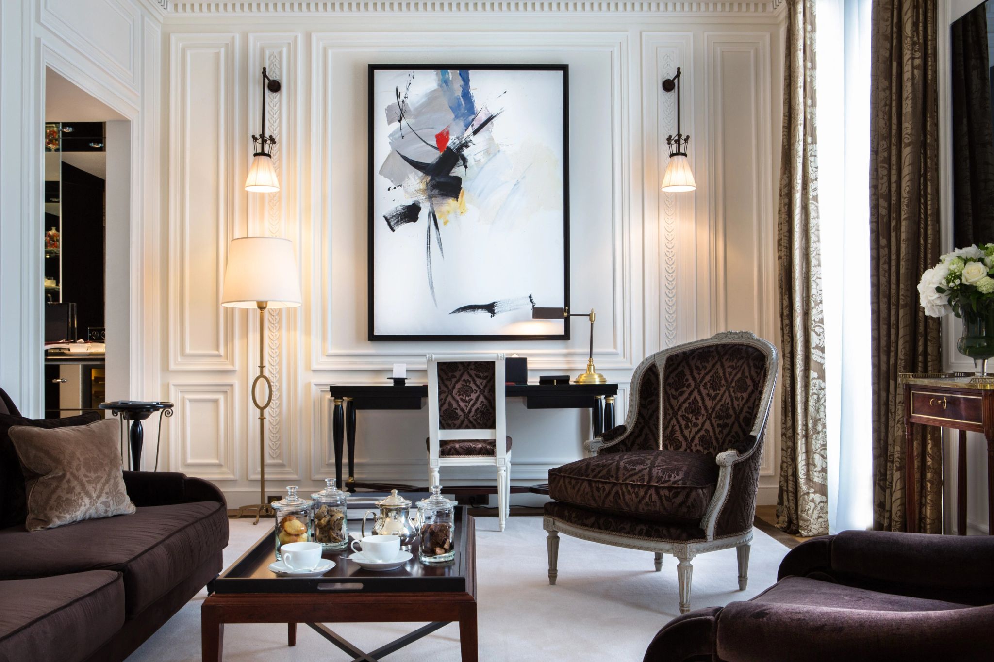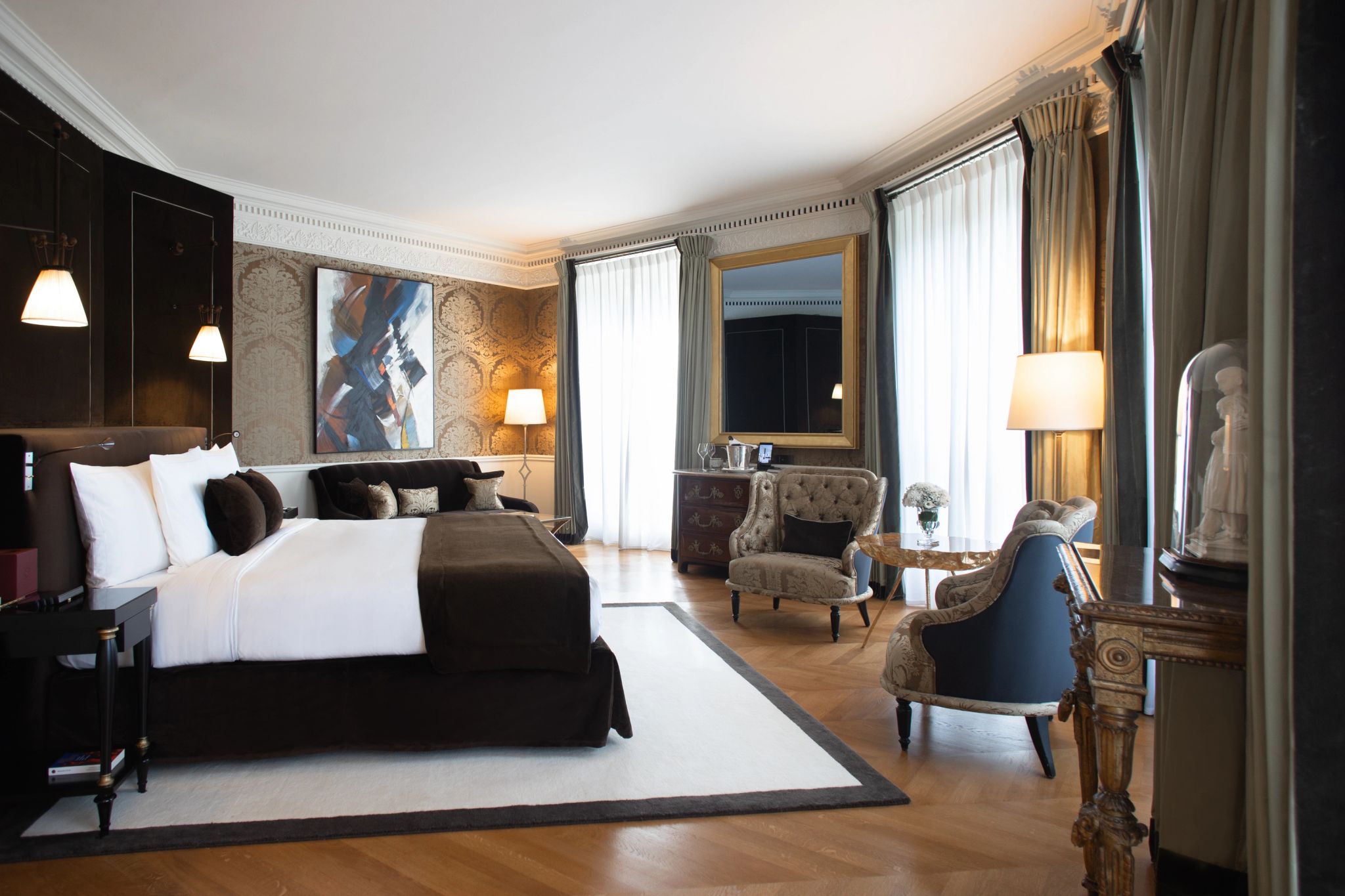 A Deluxe Suite possui tetos altos que trazem grandiosidade ao ambiente. Banhada por ampla luz natural, é uma suíte onde a elegância atemporal francesa se reflete nos mínimos detalhes. A sala de estar com sofá de veludo e esculturas de bronze é o lugar perfeito para desfrutar de agradáveis momentos de convívio social.