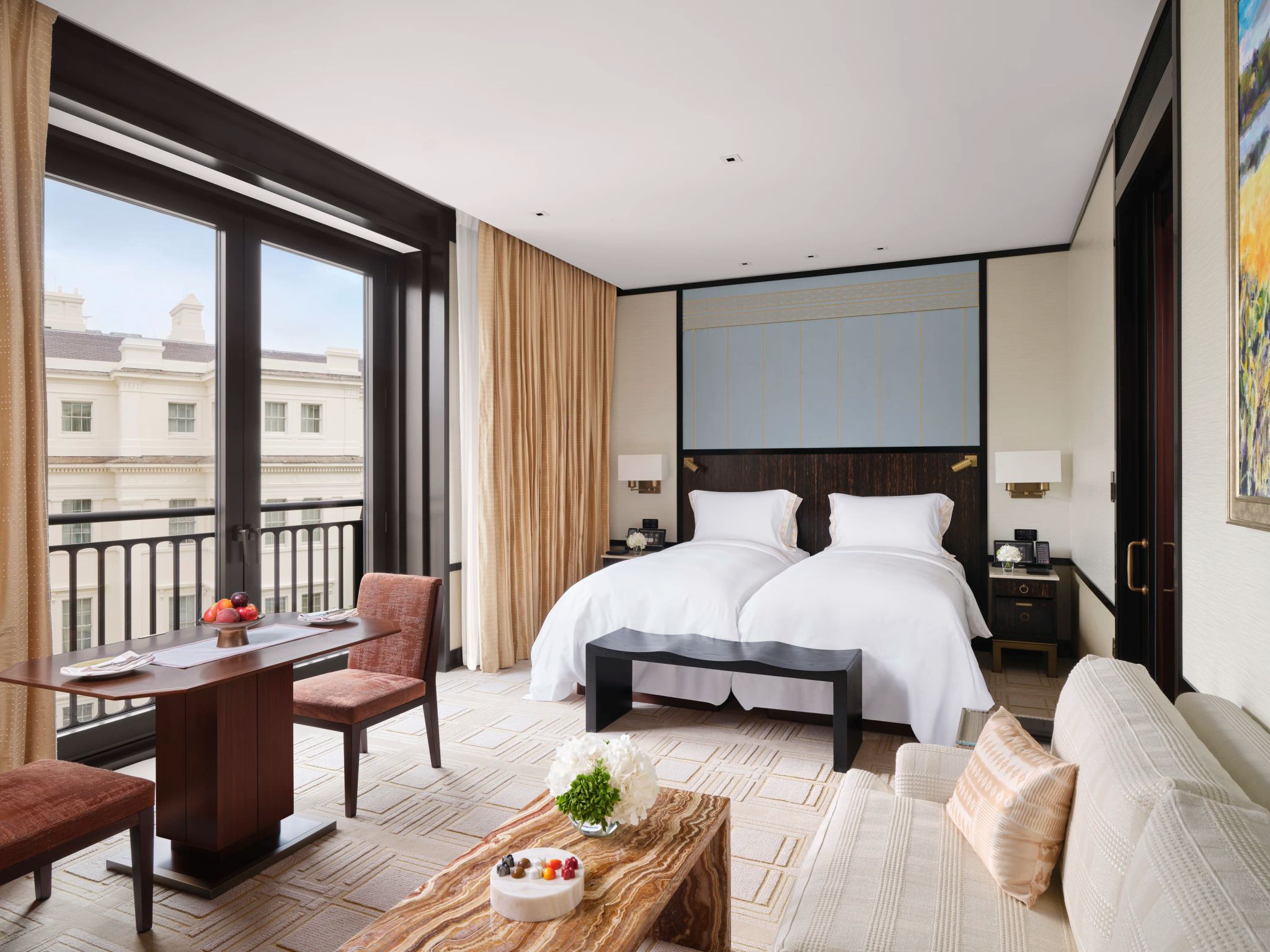 Um ambiente sereno com toques elegantes é o que o quarto Deluxe Twin oferece. A vista para o pátio transporta para um cenário deslumbrante, enquanto tecidos suntuosos e um mobiliário feito sob medida traduzem o requinte atemporal da marca The Peninsula.