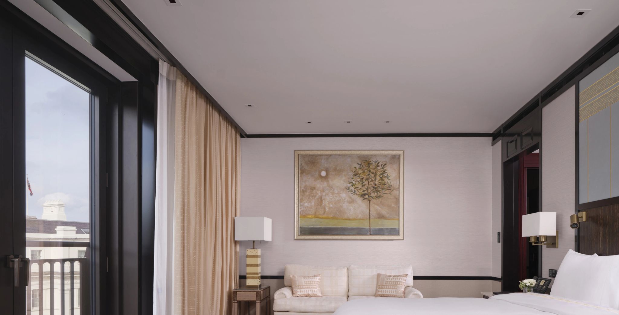 Um olhar pela janela retrata um cenário urbano em harmonia com a tranquilidade do Premier King. Este quarto, com vista para a Grosvenor Crescent e Halkin Street, encanta com peças artesanais e personalizadas em seu design, obras de arte e banheiros revestidos com ônix em tons de mel.