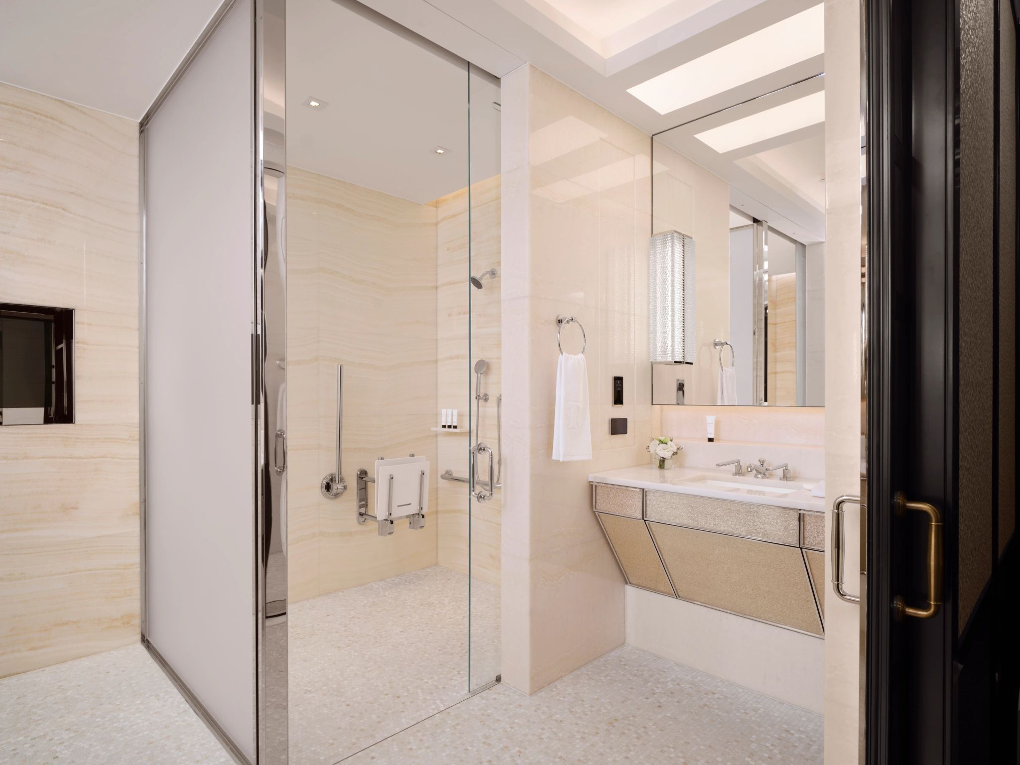 O quarto Deluxe Accessible oferece um ambiente sereno com detalhes elegantes. A vista do pátio cria uma atmosfera idílica, enquanto tecidos luxuosos e móveis personalizados refletem o requinte característico da marca The Peninsula.